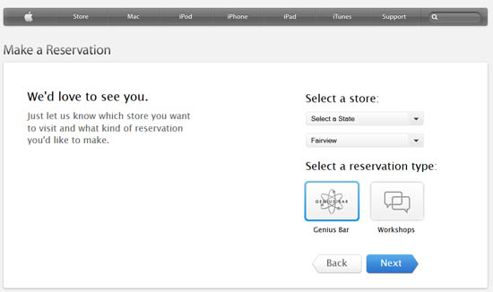 选择你想去的某家Apple 店(选择省份state和店store),再选择Genius Bar,点“NEXT”