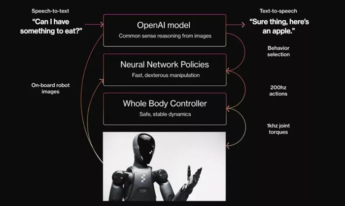 Figure此前有一个惊艳时刻——当你和机器人说,“给我点吃的”,机器人会把桌子前苹果拿给你。这意味着,机器人不仅能听懂你说的话, 还能识别到眼前桌子上有苹果,更了解这些苹果还能吃、能解人类的馋。
