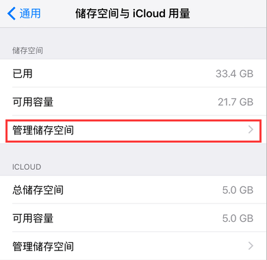 在“设置”页面中依次打开“通用→储存空间与iCloud用量→管理储存空间”选项