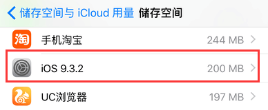 进入到储存空间详情列表页面,找到iOS 9.3.2的更新文件(不同时间下载的容量或有不同,从200MB到1G的容量大小都有),直接打开