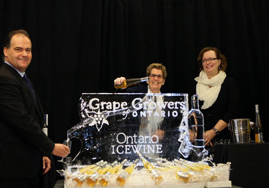 省长韦恩为宾客斟冰酒。旁为安省消费厅厅长麦茶丽(Tracy MacCharles)。