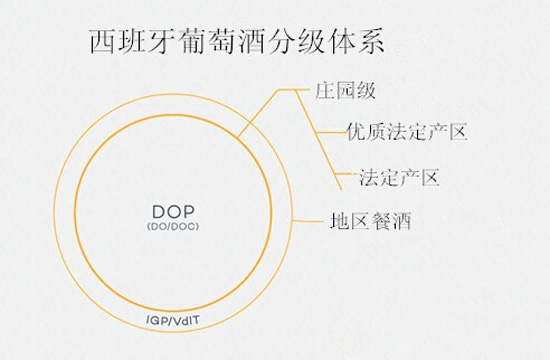 在西班牙葡萄酒的分级体系中现共有2个优质法定产区(DOC),79个法定产区(Denominacion de Origen Protegida),15个庄园级(Vino de Pagos)和46个地区级(Vino de la Tierra)。