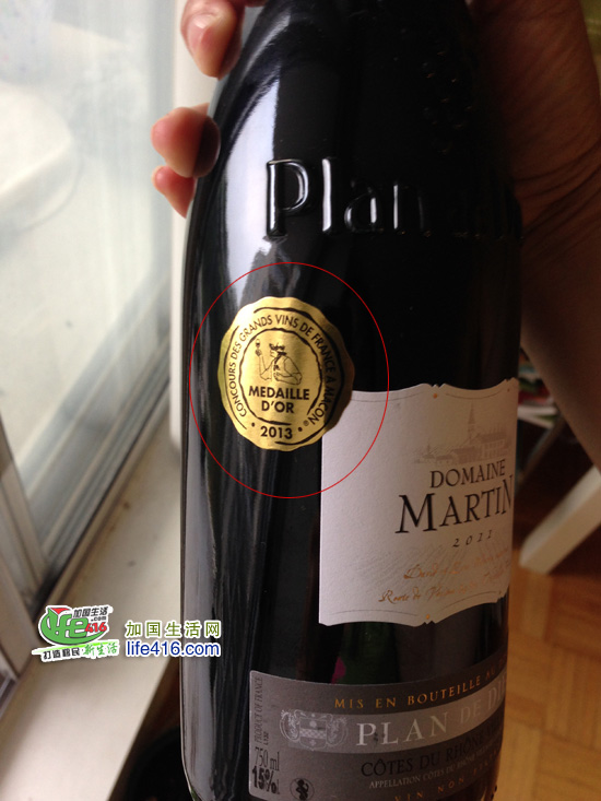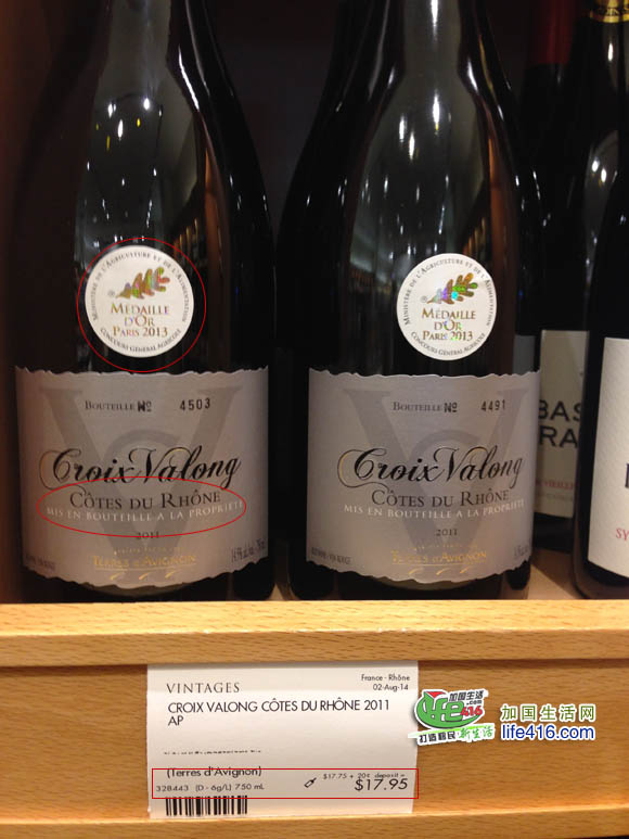 如果实在找不到的话,小编于2014年10月9日在Bayview Village 的LCBO 发现中秋介绍的那款法国红酒还有货,想买的网友快去买。同样的罗纳河谷产区、同样的获奖酒、同样的$20以内的价位,就是口感稍有些辛辣,不是太酸,适合配烤肉喝。