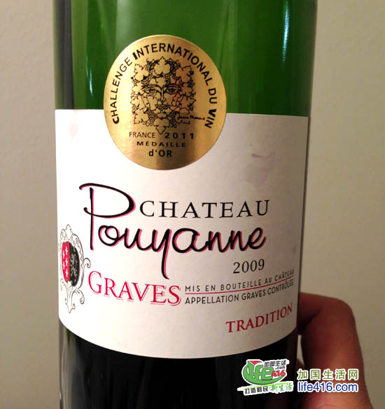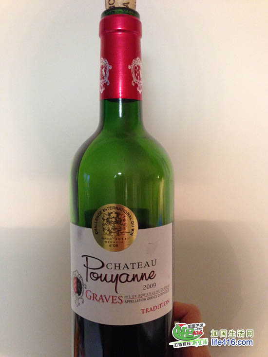 2014年5月21日:小编在LCBO 又发现了瓶特别好喝的法国葡萄酒,是法国Bordeaux 产区下的Graves 小产区的酒,2009年产的,曾获2011年国际酒奖的,$19.95一瓶。有人说这种价位的酒不需要醒酒的,小编可不这么认为。就拿这瓶酒来说,刚开瓶的时候,入口的感觉又涩又淡,挺难喝的;20分钟后再一喝,OMG,简直就是不同的酒了。一般来说法国酒都是XD(Extra Dry)偏酸的味道,虽然这瓶酒也挂着XD的标签,但该酒醒酒后的入喉味道竟然是绸绸的、凉凉的,一点也不酸涩,竟然有喝高档冰酒的感觉,真不愧是获奖的酒,绝对有个性,绝对也值得出手。