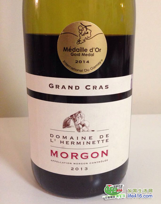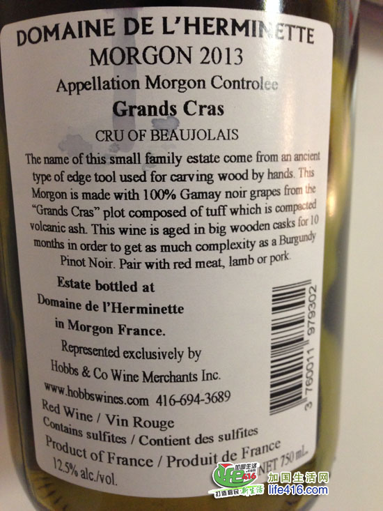 2014年12月23日小编最新爆料:圣诞了,好几个网友给小编留言再推荐一瓶性价比好的法国红酒。本着小编一贯的选酒原则:$20以下、产区好、获奖酒,小编在LCBO 千挑万选地挑出这瓶DOMAINE DE L' HERMINETTE MORGON,$19.95一瓶。MORGON 是上次介绍的罗纳河谷产区下的小产区,该产区盛产GAMAY 佳美葡萄。看到那个获奖标志没?该酒是在国际佳美酒评比中得金奖的。瓶后也写着该酒是用100%的生长在含有火山灰土质里的佳美葡萄酿制的,在木桶中至少酿制了10个月。