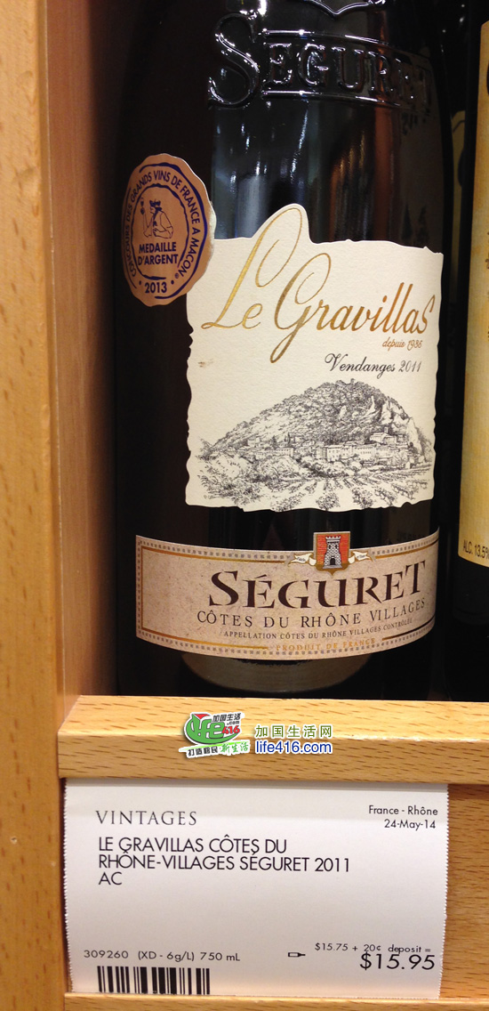 LCBO还有一瓶同样是来自罗讷河谷产区 Rhone Valley的红葡萄酒,这瓶是获得了银奖的,$15.95一瓶。同上面那瓶相比,一瓶获金奖,一瓶获银奖,价格只差$4,所以小编选了获金奖的。如果那瓶卖光了,这瓶也是个不错的选择。