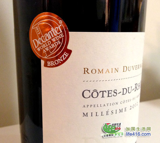 这瓶酒来自法国罗讷河谷产区 Rhone Valley,该产区与著名产区Bordeaux 和Bourgogne产区齐名,是法国历史最悠久的葡萄酒产区,该产区的葡萄酒是以口感略带辛辣为主的,小编上次中秋时推荐的罗讷河谷产区的酒就是略带辛辣的。而这次推荐的这瓶酒Romain Duvernay 的味道相当有特色,稍醒一会儿后,入口的感觉竟然有巧克力加青梅的味道(是由Grenache歌海娜、Syrah西拉 和 Mourvèdre 慕合怀特这三种葡萄酿制的),不辣也不偏酸,很好喝,怪不得该酒曾荣获世界美酒奖的铜奖呢。更重要的是,这瓶酒才$15.97。小编老公喝过后说,这酒无论从价位到口感都值得再买一瓶。于是,小编跑了好几个LCBO 店,竟然发现这酒全都卖光了(包括Fairview Mall 和Bayview Village)。于是,小编让店员帮忙查询一下哪里的LCBO 有卖这瓶酒,最后在HWY 7 和Woodbine 的LCBO 买到了一瓶(注:小编还以为HWY 7 和Woodbine的LCBO只剩下最后一瓶了,这篇文章发布后,有网友去HWY 7 和Woodbine 也买到了,那个LCBO 在9日查询的该酒的数量是15瓶)。
