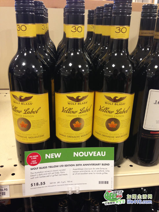 Wolf Blass 为纪念赤霞珠葡萄酒进入加拿大整整30周年而特别推出的限量版的黄色标签的Wolf Blass Yellow Label Shirza Grenache Mourvedre,这瓶酒才$18.55哟。