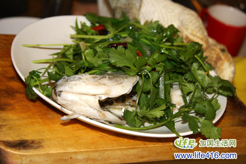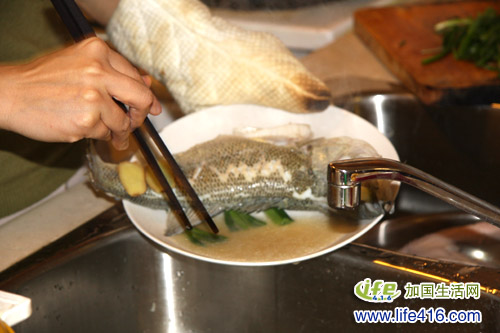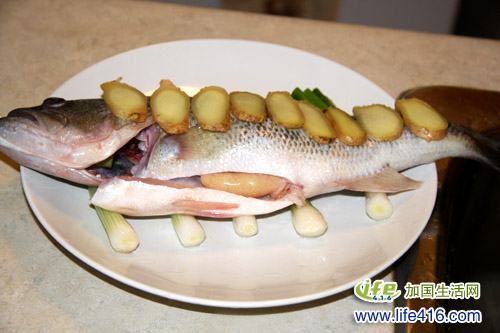 危机终于爆发了。有一天,老公下班后去超市买了条新鲜的鲈鱼(华人超市一般叫它为“青斑”)回家,说是第二天他们午饭时间要比谁家鱼做得好吃。结婚十年,他无论买什么样的鱼回家(冷冻的、新鲜的……),俺是统统做成红烧的。老公说:“你要是再做成红烧的,我就……(怎的,还想休妻不成?!)”,啊呀,问题严重了,俺急忙打电话向同事请教,终于讨到了一款清蒸鱼的做法。