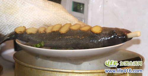 6、那5-6根架在鱼身子下面葱白是起着隔离的作用的,除了可以将带着鱼腥味的血水和鱼分离开,还可以将葱的清香加在鱼的身上。鱼嘴里的葱白也是起同样的作用。蒸完后,将鱼身子下面的以及鱼嘴里的葱白统统扔掉,还要将蒸出来的血水倒掉,姜也扔掉。