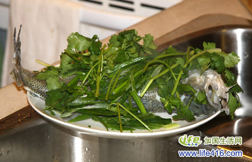 7、将切好的青葱丝和香菜盖在鱼的表面。