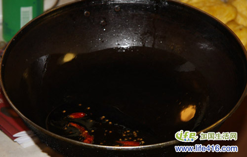 8、准备一炒菜锅,倒入油,待油烧热后,放些红辣椒。