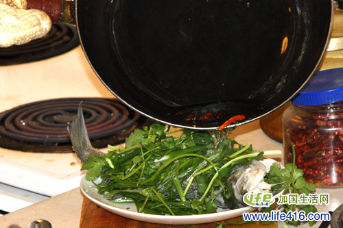 9、等油热了,冒烟了,红辣椒变成了黑色了,马上将热油淋在鱼身上。注意,住公寓的小心点,别让防火报警器响了。