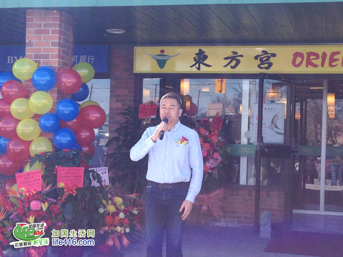 东方宫(加拿大)总经理李卓隆先生致辞感谢各位嘉宾的光临,保证东方宫加拿大公司将在品质及服务等各个环节精益求精,让以东方宫中国兰州牛肉拉面为代表的中国西部清真餐饮文化在多伦多,乃至加拿大,生根发芽,兴旺发达。