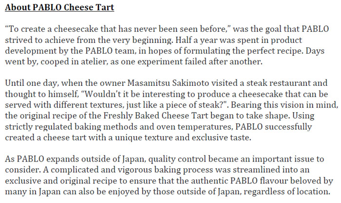 PABLO的日本CEO兼创办人Masamitsu Sakimoto介绍说:“我们非常兴奋能在加拿大开店,将我们最具创新的奶酪蛋挞带给加拿大顾客。就象毕加索贡献给全世界艺术一样,我们的目标是通过奶酪蛋挞建立一个强大的品牌,给我们的客户带来味觉上的惊讶与兴奋。”