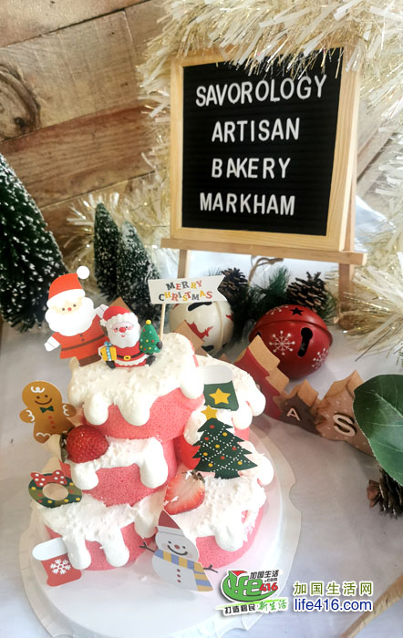 Savorology Markham新店,交通方便,为照顾各族裔不同顾客的需要,Savorology将会推出与Scarborough总店不一样的产品,如:圣诞老人模样的蛋糕卷或是圣诞主题的叠叠乐蛋糕(如下图)等等。