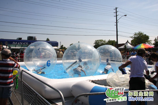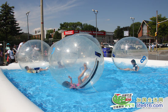 孩子的游乐场吸引了许多孩子。这个项目是水上气泡泡,孩子钻进充好气的气球中,就可以在水中随便滚来滚去的。这个创意还挺不错的。