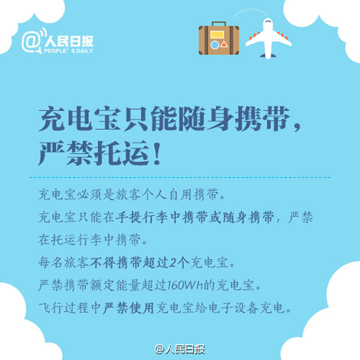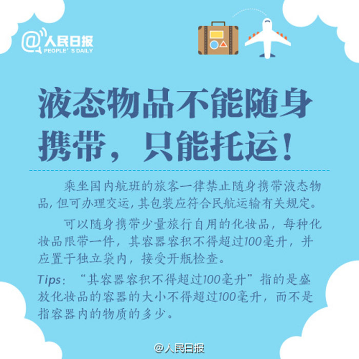 ①经济舱随行行李限1件,限重5公斤;②免费行李托运限重20公斤;③备用锂电池、充电宝只能随身携带,不能托运;④打火机、火柴既不能随身带也不能托运;⑤化妆品每种限带一件,容积不超过100毫升……国内航班行李规定,留存备用!