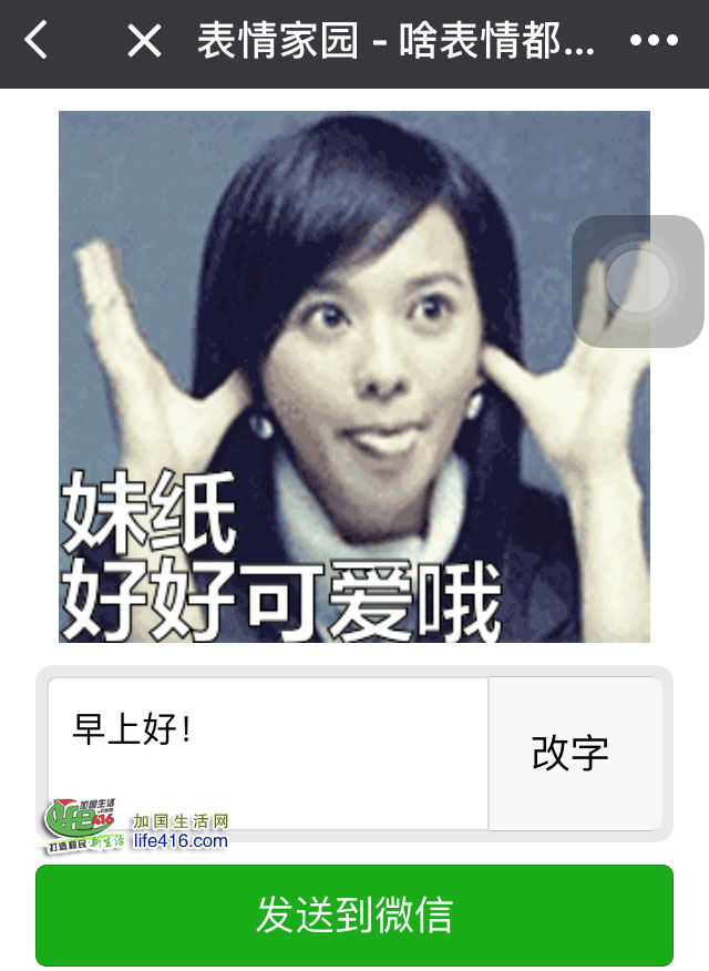 【加国生活网专稿】现在大家都爱在微信群里聊天,有些人爱发表情包,但大部分的表情包都是别人设计好的,你没法修改上面的文字。下面加国生活网小编就教大家如何在微信中发个性十足的或是写有个人名字的动画表情包(也就是说动画图片上的文字可以随意编辑),绝对吸引人的眼球!