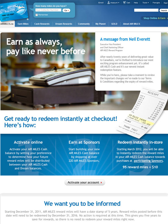 如果你想使用Air Miles Cash 项目,现在就可以开始积点了。到Air Miles 网站,进入你的帐户激活一下,需要选择一下,即你是希望以后所积的点全部进入Air Miles Cash 积点帐户还是正常的Dream Rewards Miles,还是同时进入这两个帐户(可以设成两个帐户各占百分之几)。激活帐户后,等到了2012年3月,如果Air Miles Cash 帐户已经有了95点,就可以换$10了。如果不激活Air Miles Cash 帐户,Air Miles的点数将只会进入正常的Dream Rewards Miles,你可以汇换别的产品,但不能汇换成$10。
