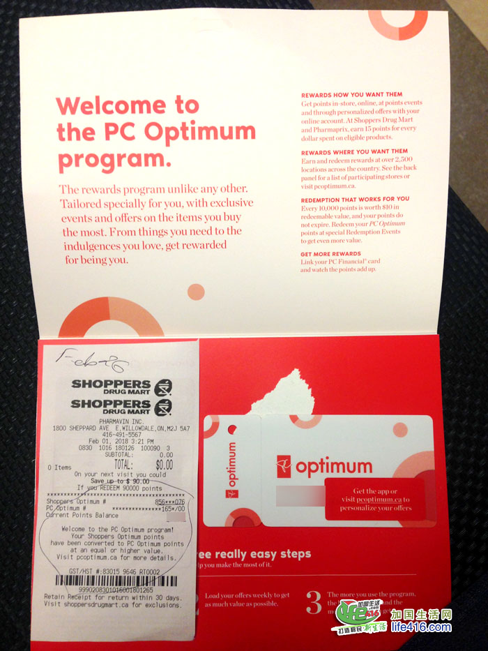 1、前往Shoppers或Loblaw超市等Loblaws旗下的近2500家店铺中的任何一家,将现有的PC Plus或Shoppers Optimum卡换成PC Optimum卡。即从2月1日起,如果你去Shoppers等店铺买东西的话,只要出示了旧的Shoppers Optimum积分卡,店员会主动帮你换成新的PC Optimum卡,在换的同时,会在系统里把旧卡里的积分同时也转换到新卡里了。比如,小编的旧卡里有5万点,转换成新卡后变成了8万5千点,Shoppers也会在现场出示收据告诉你有多少点转入,而旧卡也同时在现场回收,并发给小编新卡。