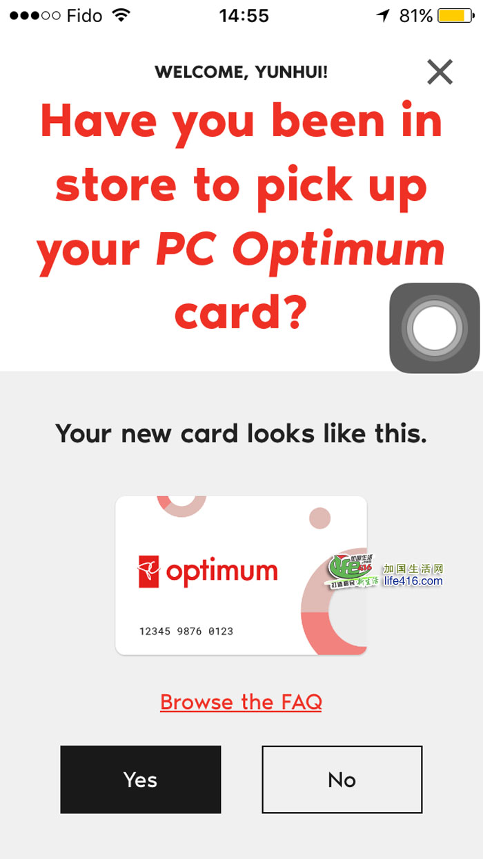 6、之后系统还会问你是否去店里领新的PC Optimum卡了?回答Yes后,输入新卡的卡号,则系统里又自动加上了Shoppers卡里的积分。
