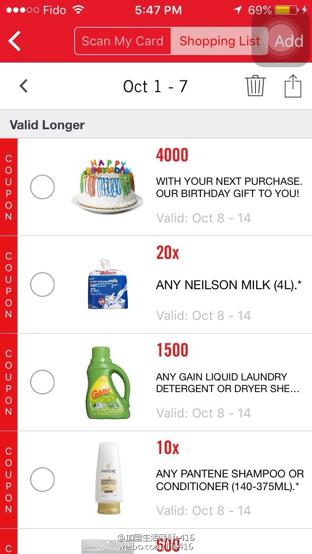 另外,大家都装了ShoppersDrugMart 的最新手机APPS 没?小编发现ShoppersDrugMart 把一些实用的优惠券放到了手机App上, 这个App里要求把你的Shoppers Optimum Card 积分卡绑定在一起,这样你就可以下载优惠券到积分卡上了。当你购买优惠券所示的产品时,一刷积分卡,优惠券上的积分就加到卡上了,以前要是要等很久才能加上。再配合着周末进行的购物积分活动,双重积分的速度也是挺爽的。