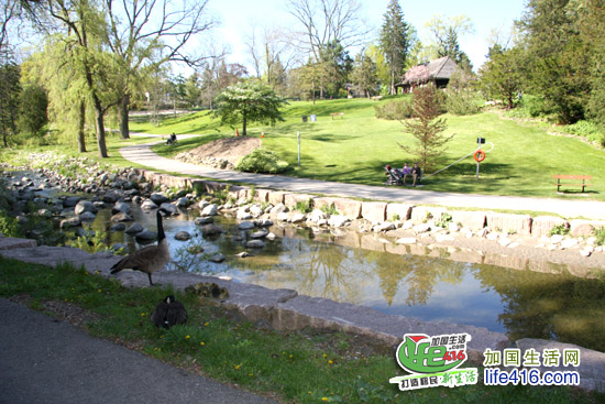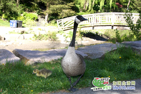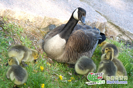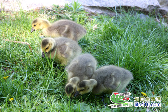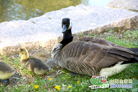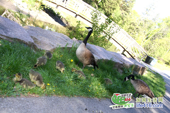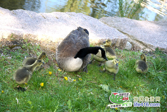 【加国生活网专稿】相信许多移民朋友经常能在加拿大各地看到已经成年的Canada Goose,但“婴儿时期”的Goose 却很少能见到。加国生活网小编在前两周发现多伦多Edwards Gardens 住了一对Canda Goose 夫妇,春天来了,它们的七个孩子也出生了。那时,孩子们还特别小,刚刚学会走路,可惜的是小编未拿相机。一个星期后,小编拿着相机再次来到Edwards Gardens时,发现真是“有苗不愁长啊”,七个孩子已经长大了一圈。