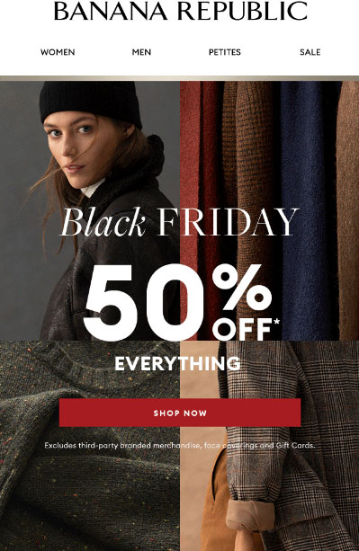Banana Republic的实体店和网店都是五折优惠,网店超过$50订单免邮费,详情:https://bananarepublic.gapcanada.ca