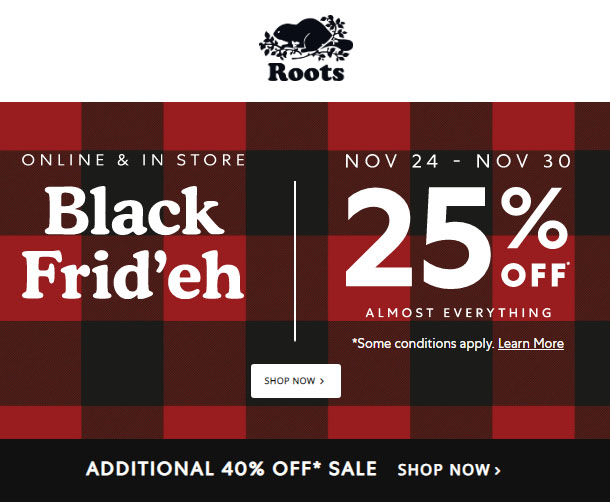 根据加国生活网小编这几年的经验,加拿大著名Roots品牌,全年最高打折力度是七折,一般仅一天,紧接着一周是打八折。如果黑五当天Roots没有打到七折、甚至八折,根本就不值得大家出手。好吧,现在Roots 在2020年的黑五促销出台了,从11月26日至11月30日是全场75折优惠,部分产品有6折优惠。详情:https://www.roots.com/ca/en/homepage