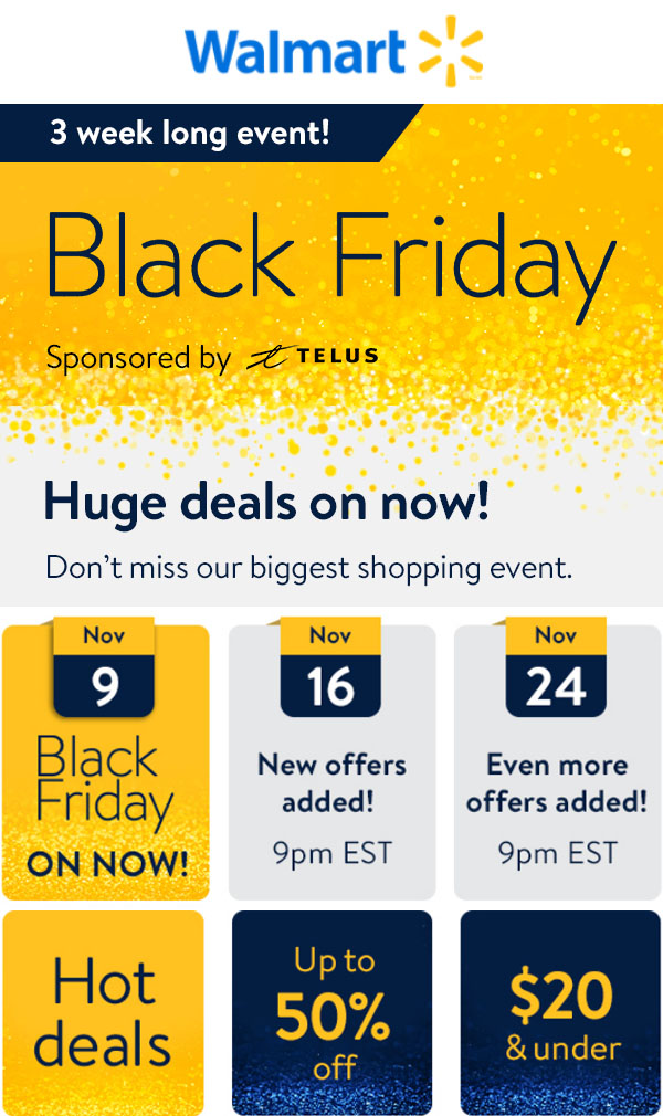 Walmart从11月10日起提前三周在店内开启了BLACK FRIDAY 打折优惠模式(在线网站更早是从11月9日开启的),许多商品款式up to 50% off 或 $20以下 或 电子产品up to 40% off,更多详情请点击链接查看优惠Flyer:https://www.walmart.ca/flyer
