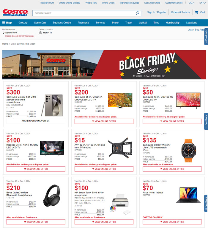 【加国生活网】Costco的黑五促销也是已经提前开始了,从科技产品、家电到服装、轮胎和厨具等所有商品均有折扣,包括三星Galaxy S24 Ultra手机优惠$300、三星65英寸电视优惠$200、三星智能手表优惠$135、Bose QuietComfort蓝牙耳机优惠$210等等。需要注意的是:有些优惠仅在店内或网上有效,优惠产品可能因地点不同而有所不同。更多促销产品:https://www.costco.ca/coupons.html