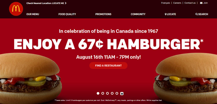 为庆祝这个50年开业大喜,麦当劳于8月16日星期三从上午11点至下午7点在全加拿大超过1400家麦当劳店推出庆祝生日的特价汉堡,$0.67一个,每人限购3个。