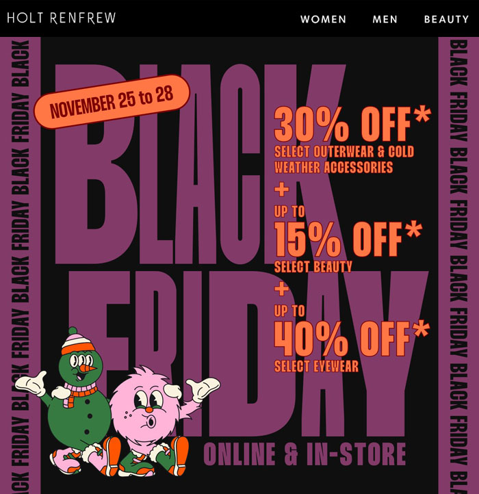 作为高端品牌云集的Holt Renfrew,指望其有大放血的促销是不太可能的,其今年黑五促销力度一般般,最高打折才六折,而且还是针对性的部分产品。详情请点击这里查询。