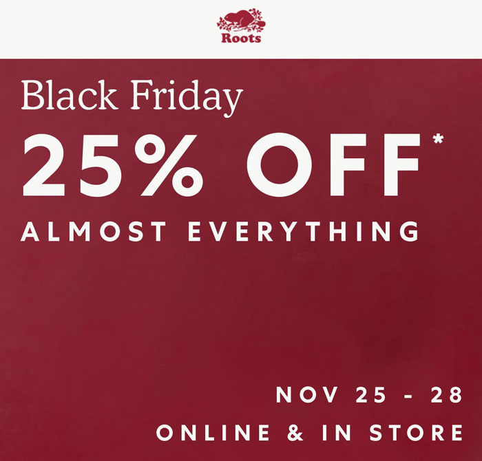 根据加国生活网小编这几年的经验,加拿大著名Roots品牌,全年最高打折力度是七折,一般仅一天,紧接着一周是打八折。如果黑五当天Roots没有打到七折、甚至八折,根本就不值得大家出手。好吧,现在Roots 在2021年的黑五促销出台了,从11月25日至11月28日是全场75折优惠,线上和店内同时进行。详情:https://www.roots.com/ca/en/homepage