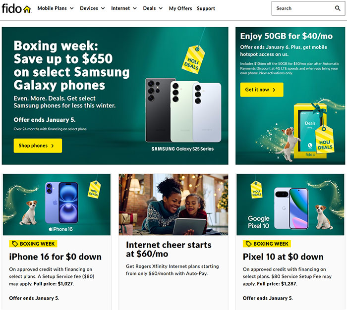 Fido 推出的boxing week促销也挺有吸引力的,比如每月$40给50G流量,如果你想搞个iPhone用的话,Fido推出的流量套餐中可以绑定iPhone 16手机,无须付首付,签2年合约,每月付$33(iPhone手机费用)+流量费用(Fido指定的套餐),就可以得到iPhone 16。还有许多Deal,大家可以去官网查询:https://www.fido.ca/