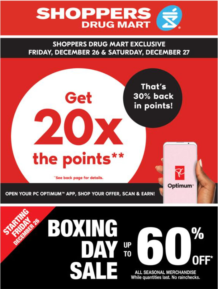 ShopperDrugMart在12月26日和12月27日这两天有购物满$75有20倍积分的优惠,同时在Boxing Day当天许多商品up to 60% off 优惠。12月28日和12月29日这两天则是要么给20倍积分、要么直接给25000点、要么某此商品免费,这些优惠会根据每个app帐号有所不同。小编感觉ShopperDrugMart在2025年boxing day所给出的优惠没啥惊喜,不如黑五积分换物额外加额度来的实惠