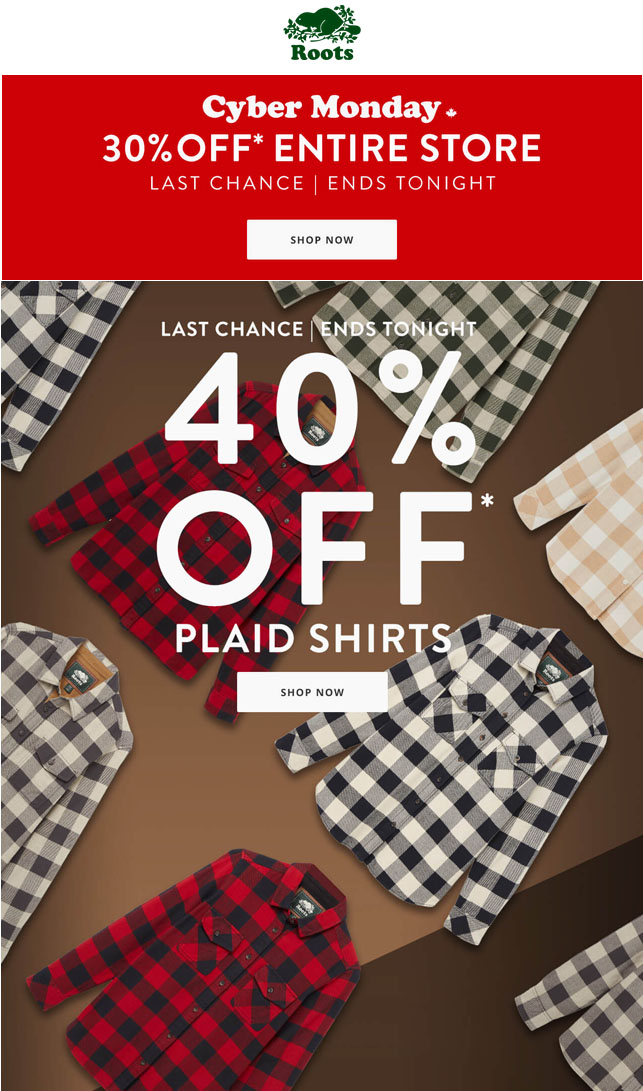 Roots今年黑五的促销力度同去年一样,从11月27日至12月2日连续6天全场7折优惠,而且每天还有不同的产品6折优惠,Cyber Monday网络星期一这一天全店和网店都是七折优惠,额外6折优惠的产品是衬衫。网址:http://www.roots.com