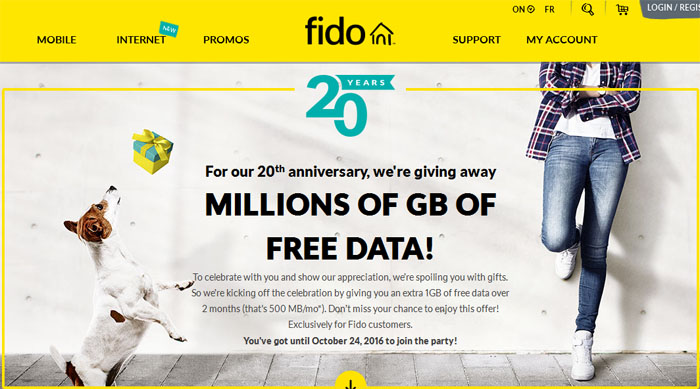 Fido 20th Anniversary 20周年庆优惠免费送1G流量 2个月有效