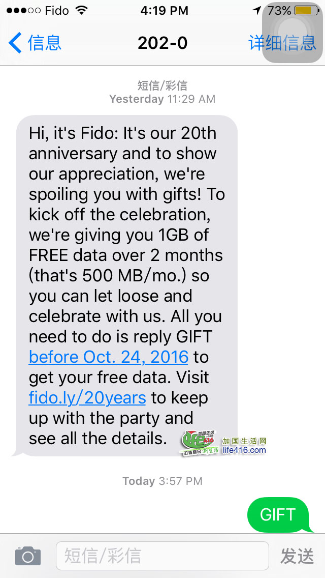 如果你已经是FIDO客户,你的手机会收到以上短信,10月24日之前回复短信“GIFT”就可以收到如下回复:
