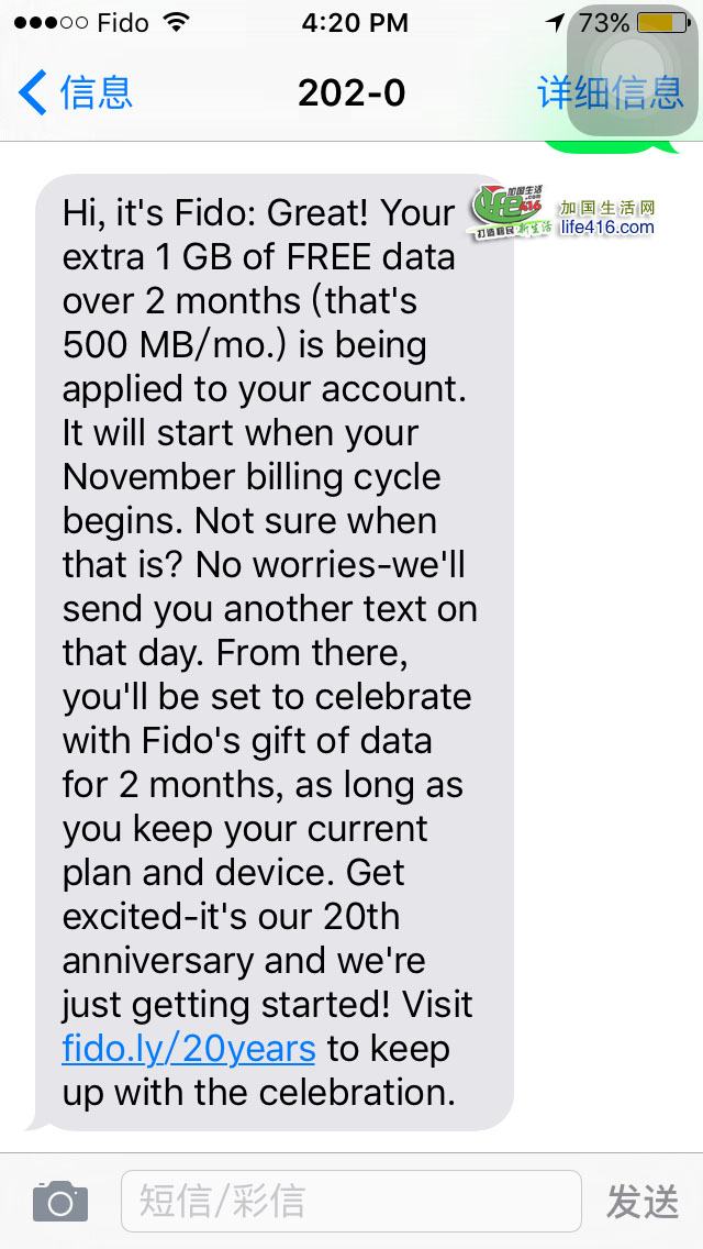 【加国生活网专稿】加拿大Fido电讯公司为庆祝公司成立20th Anniversary 20周年,特免费赠送1G流量,2个月内有效。全加拿大的FIDO客户都可以申请。