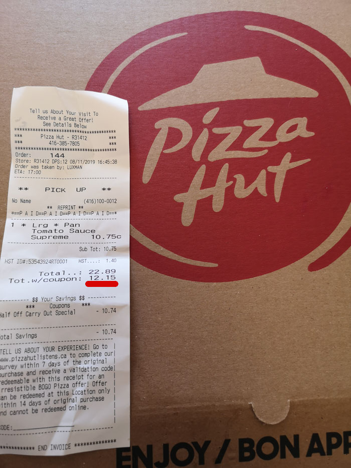 但这个促销Deal并不是一直都有,目前小编在Yorkmill Road上的PizzaHut店里看到有这个促销Deal,也只在店里订有效。地址:#5 861 York Mills Rd, Toronto, ON M3B 1Y4 点击查看Google地图