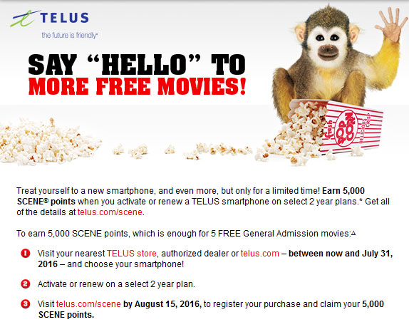【加国生活网】如果你准备买手机签计划的话,如果你在2016年7月31日之前正好签了TELUS智能手机两年计划的话,一定不要忘记去申请5000点的 SCENE积分(8月15日之前申请),这个SCENE积分是加拿大Cinplex电影院看电影的积分计划,每积1000点可以免费看一场电影(3D等高级电影需要更多积分), 这样的话则意味着可以看5场免费电影。