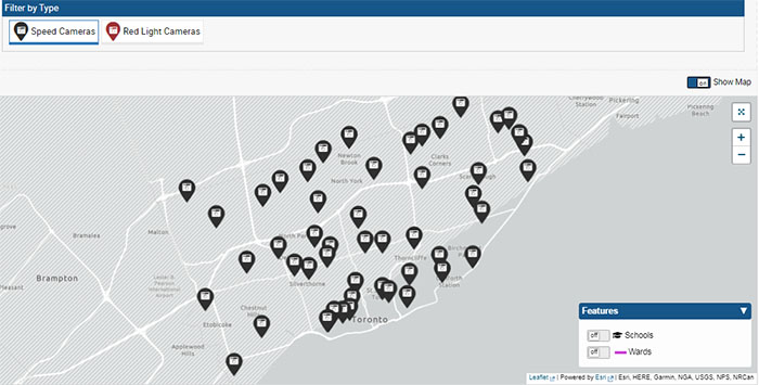 大家若想知道这50个ASE摄像机的具体地址,请点击这里,链接是多伦多市政府ASE的官方网站地图,上面除了ASE摄像机外,还有红外线摄像机,点击地图上方的“Filter by Type”的“Speed Cameras”就可以看到50个ASE的具体地址了。需要注意的是,这50个地址每隔一段时间会变化的。