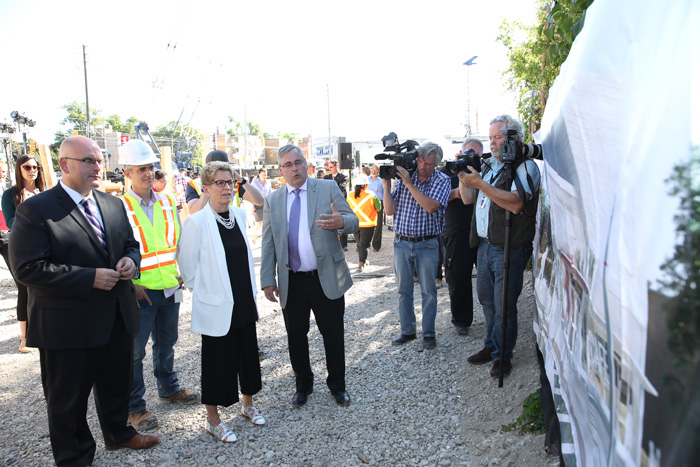 【加国生活网】加拿大最大型的公交项目 -跨市艾灵顿轻铁线(Eglinton Crosstown Light Rail Transit,简称LRT)- 中点站Laird Station于2016年6月30日动土。省长韦恩30日一早亲临建筑地盘,见证这个公交建造里程碑的开展盛况。