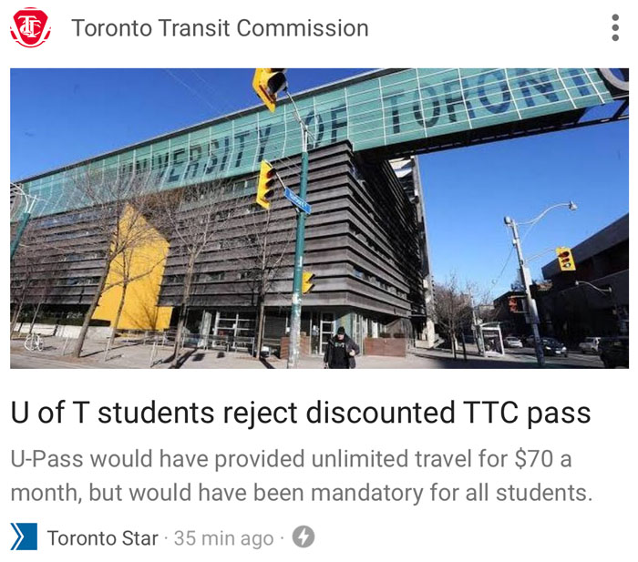 反对该计划的多大脸书页面警告说U-Pass会“不公平地给居住在校园附近的学生带来经济负担”,他们不需要这种TTC服务。