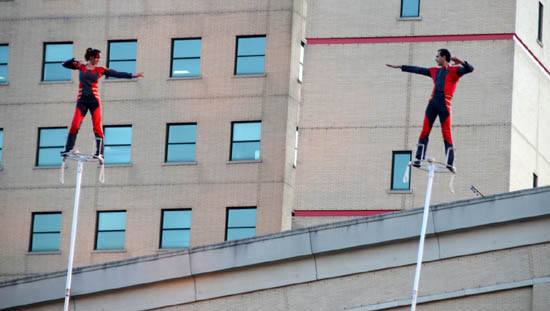 两个演员在空中飞行,最后竟然换了杆子,让人赞叹不已