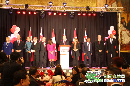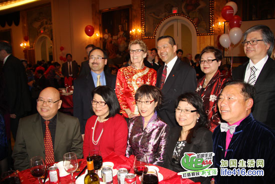 【加国生活网专稿】2013年2月11日大年初二晚,安省新上任的首位女省长韦恩(Kathleen Wynne)率领部分内阁成员出席在烈治文山钓鱼台国宴举办的华裔社区庆祝蛇年春节晚宴,与各个族裔的省民一起共同庆祝中华民族的传统节日春节。