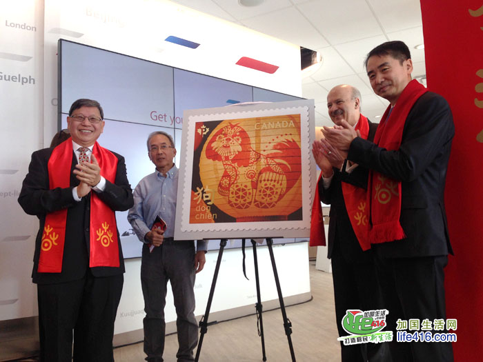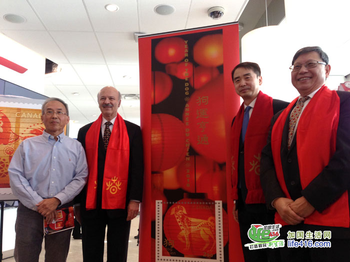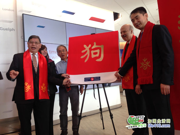 中国驻多伦多总领馆总领事何炜(左二)、安省科技厅长莫伟力(Reza Moridi,右二)、烈治文山市议员陈治辉(右一)、狗年生肖邮票书法设计师伍启荣(Albert Ng,左一)出席了此次庆祝活动
