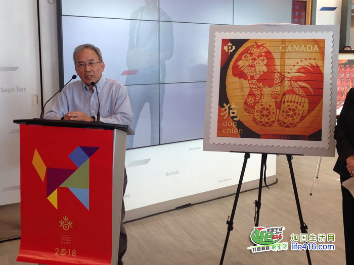 2018年狗年生肖邮票是由加拿大温哥华的Subplot Design Inc公司设计,插画及摄影分别由Meimei Mao及Rafee Miles担任,而邮票上的中文书法则是由来自多伦多的Albert Ng(伍启荣)书写,这是Albert Ng在致辞。